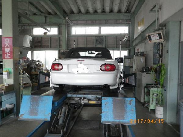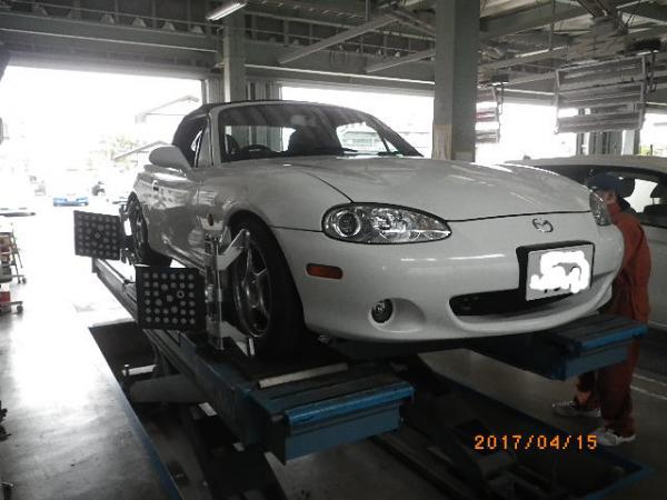 今日は、昨日の予告からの・・・・・・・。先日HPからお問い合わせいただいたS様の真っ白でピッカピカのユーノスロードスターのアライメント調整をさせていただきました。