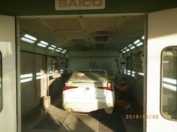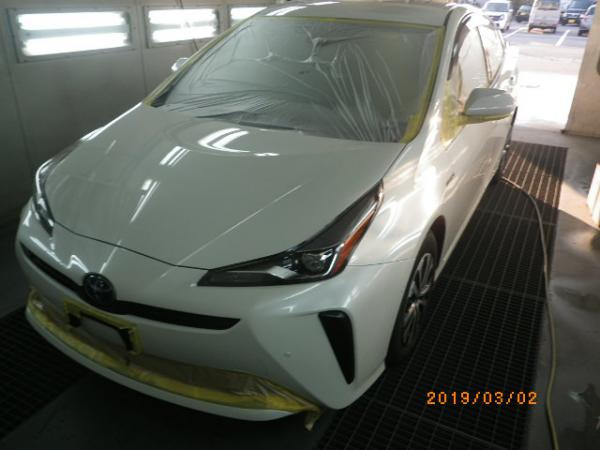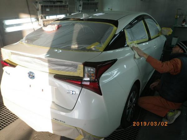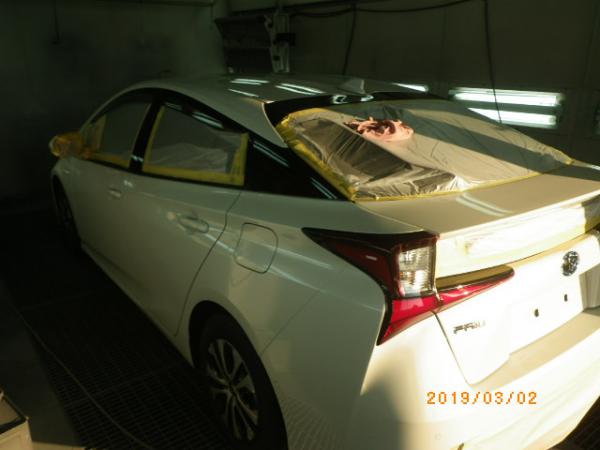 さて、本日はK様の新型プリウスのクオーツガラスコーティングを承りました。K様におかれましては、もう既に何台目でしょうか?新車をご購入されるたびに当社の取り扱っておりますクオーツガラスコーティングをご指名頂いております。それだけの信頼を頂いている証拠でしょうかね。当社の塗装技術部長が入念にマスキングを施し、塗装ブースに持ち込んで、スプレーによる施工で細部に行き届くように丁寧に施工されていきます。アフターも抜かりなくです。