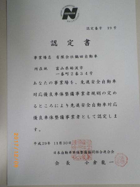 さて本題ですが、11/30付けでタイトルにありますように少し長いですが、「先進安全自動車修理優良車体整備事業者」に認定して頂きました。富山県では当社が1号店となります。