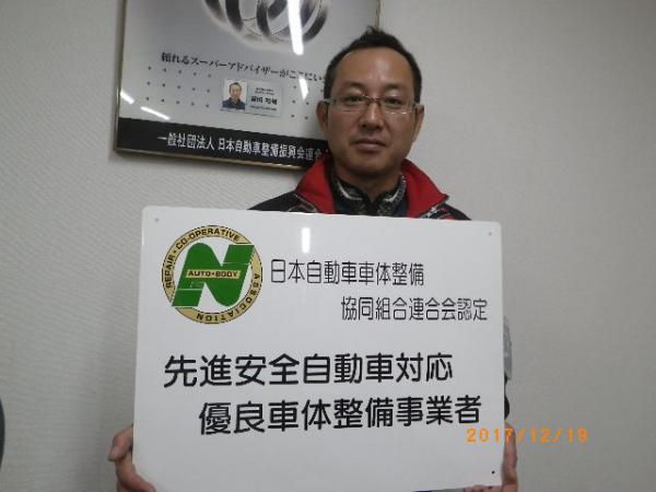 本日、新たに看板が付きました。先日も紹介しましたが、富山県で第1号店に認定して頂いた、「先進安全自動車対応優良車体整備事業者」の看板が来たぁ〜!!と言う事でご紹介です。