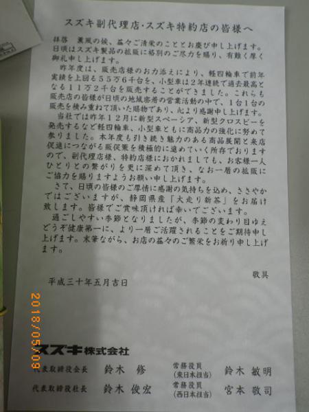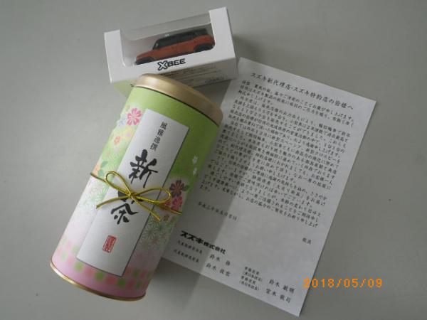 スズキのお膝元は静岡県です。その静岡でも有名なものが「お茶」ですよね。で、今日はスズキ自販富山の砺波店の店長でズンドコ節が大好きなT店長より特約店としてもっと頑張れ!!のお手紙と、素敵な「お茶」を頂きました。