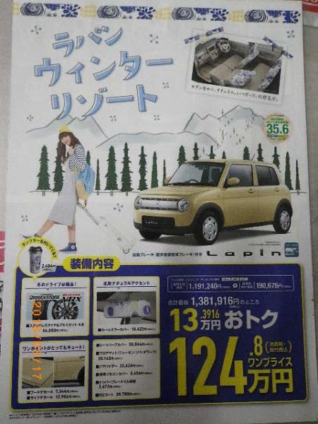そんな中、またしてもスズキの凄腕営業マンのK氏より、スペシャル価格に設定されたアルトラパンの提案を頂いたので、さっそく紹介したいと思いますよ。びっくりして下さいね。まずもってかなりお得に設定されているウインタリゾートパッケージ!ワンプライスで124.8万円!リゾートラパンもワンプライスの120万円(諸経費はかかりますがこれはこれでかなりお得)ですが、そのさらに斜め上を行く提案がやってきました。訳ありと言っても新車です。短期決戦ですべて吐き出してしまえ!!!