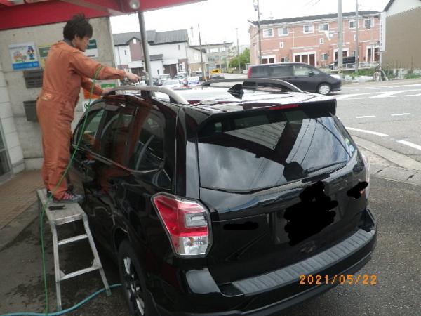屋根を磨きながら、車内でコンピュータでの診断をしています
