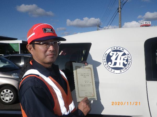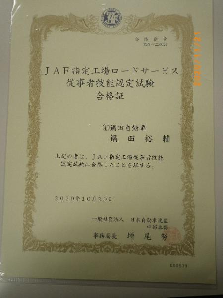 さて、本日はJAF様より先日行われた従事者技能認定試験の合格証が届きました。
